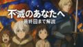 「不滅」とは終わらないことを意味します。しかし、“終わらない”というのは物語が同じ場所をぐるぐると繰り返すことではなく、新たな時代へと受け渡されていくこと。EDとCパートに込められた未来への希望は、まさにその証明なのだと思います。最終回の余韻がここまで長く響き続けるのは、この布石が視聴者の心に“これからも物語は続く”という安心感を与えたからにほかなりません。