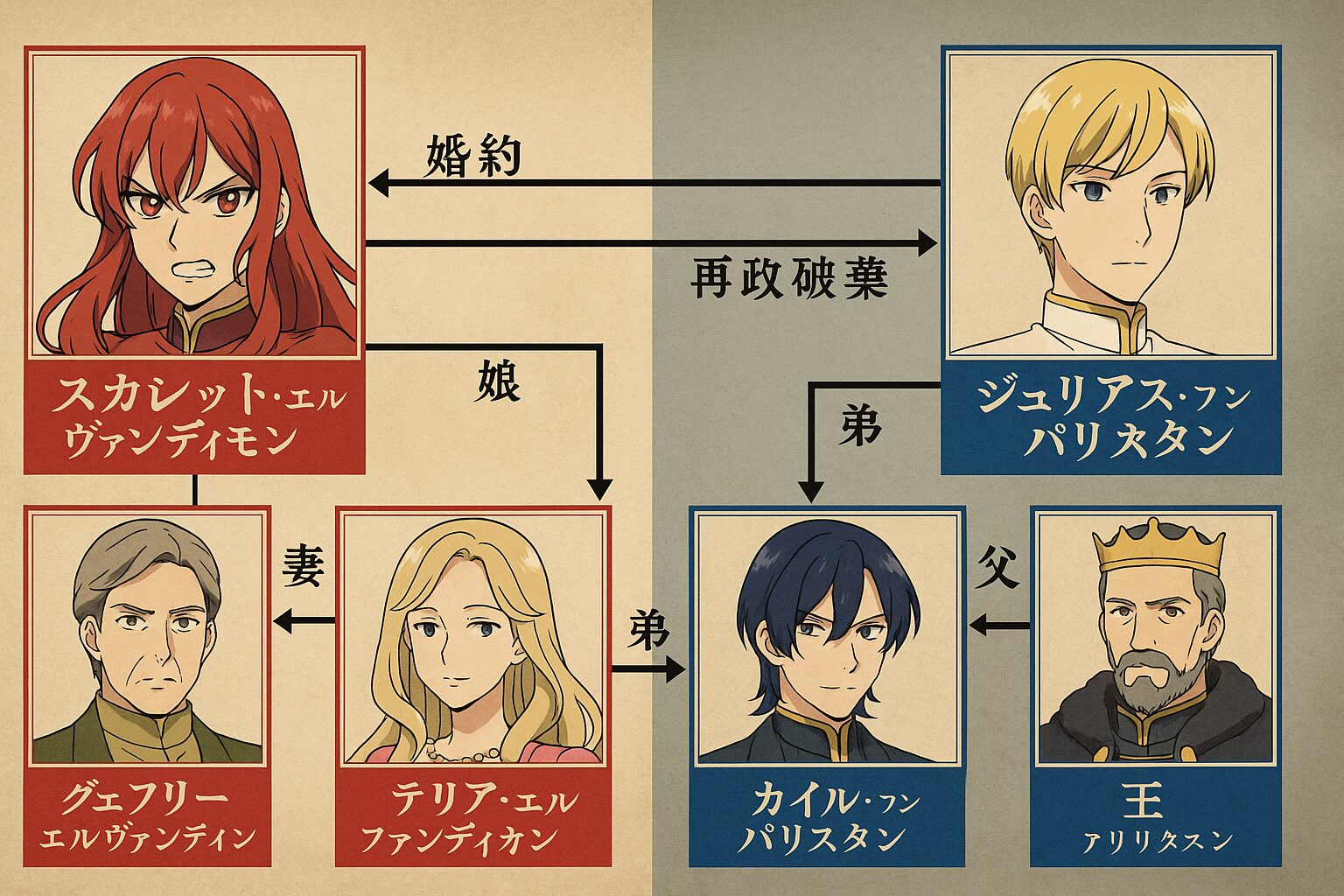 パリスタン王国とヴァンディミオン家の関係図を、ただの血縁や役職で見ると浅い。しかし、「契約」「沈黙」「象徴」という三つのレイヤーで重ねて読むと、世界が立体的に見える。スカーレットが拳を振り上げた瞬間、王国の契約構造は崩れ始めた。彼女は“愛を壊した女”ではなく、“構造を壊した革命の中心”だったのだ。