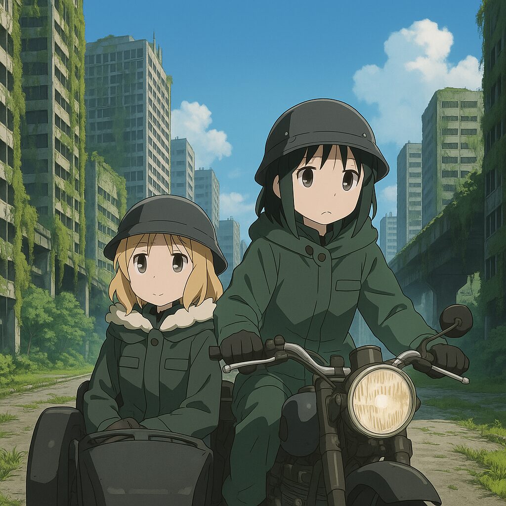 私自身、ヨーコとアイリを見ていていつも思うんです。「夕暮れの海辺を歩いている二人の背中みたいだな」って。夕日はきれいだけど、沈んでしまうことを知っている。明日が来るかどうか分からない世界で、でも二人は笑ってる。その光景が、希望と絶望の真ん中に立つような、妙な心地よさを生んでいるんです。終末ツーリングは“滅びた世界のロードムービー”なんだけど、本当は二人の関係性そのものがラストへ向けてじっと呼吸している物語なんじゃないかと、最近は強く感じています。