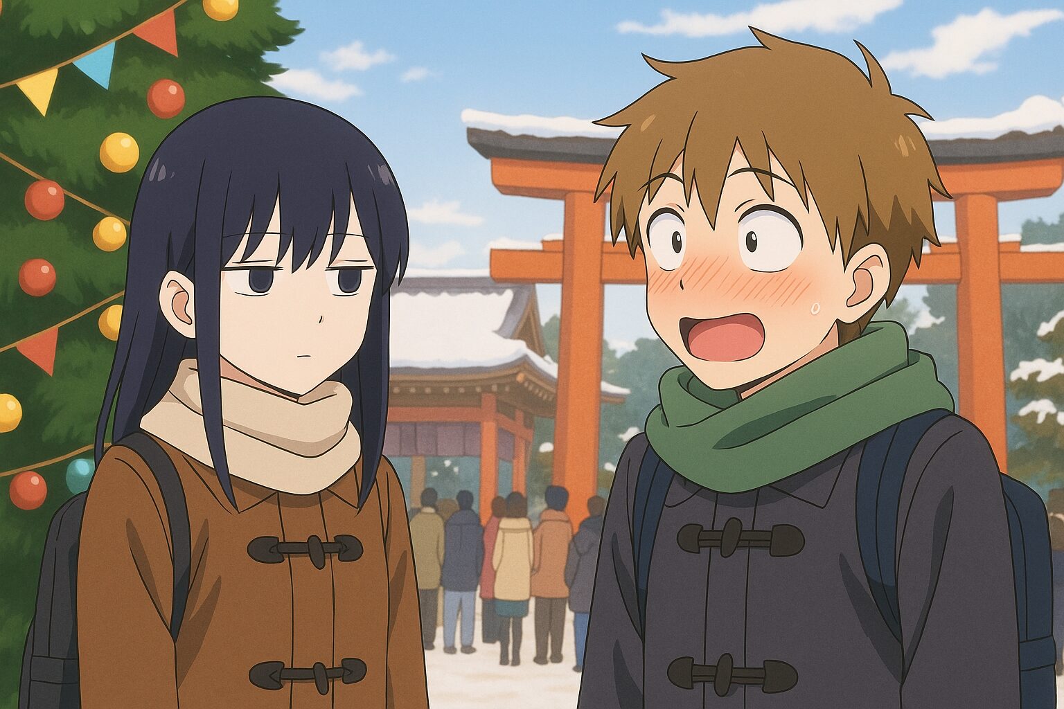 冬の神社って、あの独特のしん……とした空気があるじゃないですか。人が多いのに静かで、灯りは暖かいのに空気は冷たい。あの矛盾の空間に、恋愛が似合わないわけがない。作品側もしっかり理解していて、背景の描写や光の反射まで丁寧に作っているのが分かる。視聴者が「背景が綺麗」「空気感の勝利」と書くのも納得のシーンです。