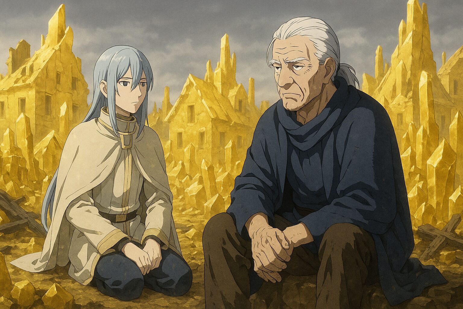 黄金郷編は、『葬送のフリーレン』の中でも、明確に「時間」を主役に据えた物語だと感じています。勇者ヒンメルの死後を描くこの作品は、もともと時間感覚が独特ですが、黄金郷編ではそれが極端な形で提示される。街が黄金に変えられ、そこにあった人の人生や営みが“停止”する。その残骸の上で、物語が静かに進んでいくんです。